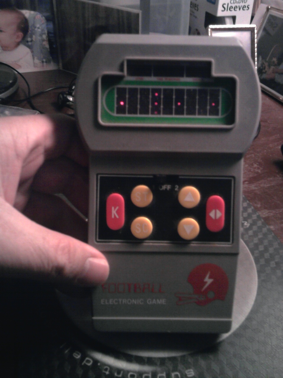 2. John Madden was still coaching the Raiders and likely hadn’t even dreamed of putting his name to an electronic football game when these handheld games were all the rage in the late 1970s. This is my actual game, and it still works. You couldn’t throw a pass on this version, and it was incredibly easy to beat after playing a couple of games; the only challenge then was seeing how high you could run up the score before the time ran out.  My hand was a bit smaller when I first got the game.