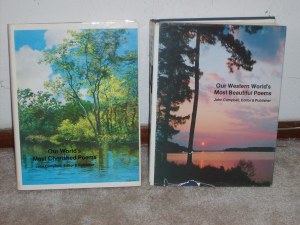 Oh, but to ensure publication, I was encouraged to buy a copy of the book in which my poem was set to appear. Our Western World’s Most Beautiful Poems, the first I was in, cost only $69.95. My mom bought one, too. Our World’s Most Cherished Poems was slightly cheaper, I think. There’s no price on the dust jacket, but it’s thinner. Both volumes feature multiple photos of the editor on the back of the dust jacket, including an appearance he made on The Steve Allen Show. I guess in hopes of proving World of Poetry and editor John Campbell were legit.