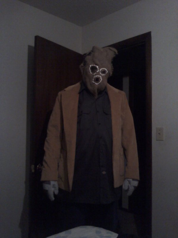 Unfortunately, my costumes are seldom appreciated. This scarecrow from 2011 made the little kids too afraid to come to the classroom door for candy so I had to take the mask off. On Halloween night I made a quick T frame and “hung” myself on it in the front yard. The bigger kids would ask each other if I was real … and I was happy to jump off the frame and show them.