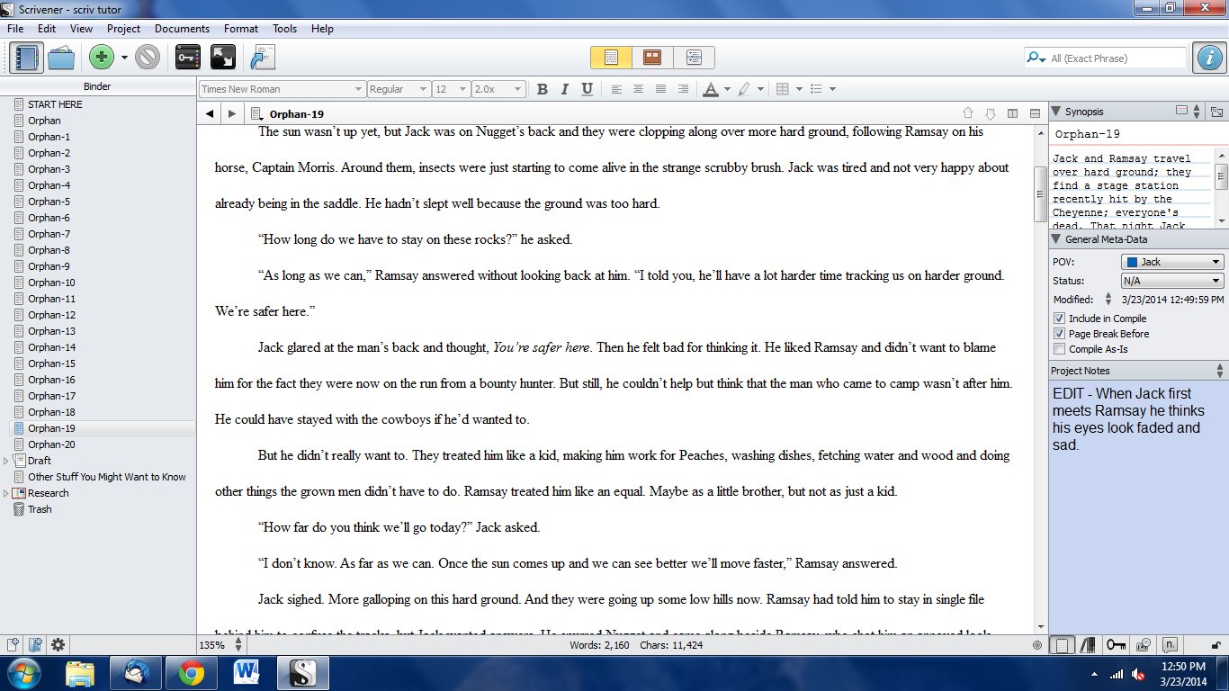 Scrivener allows me to make notes and assign those to the specific chapter or make them available throughout the entire document. For instance, I had not mentioned the eye color of one of my characters, but later on that became important, so I can put in a note that will be there nagging at me until I go back to the chapter where that should be mentioned and make the edit. Here’s another screen shot that shows the text as I was working on it. The synopsis card is at the top right, with meta data under it, and project notes under that. All my chapter files and any related files (if I’d assigned any yet) are on the left.