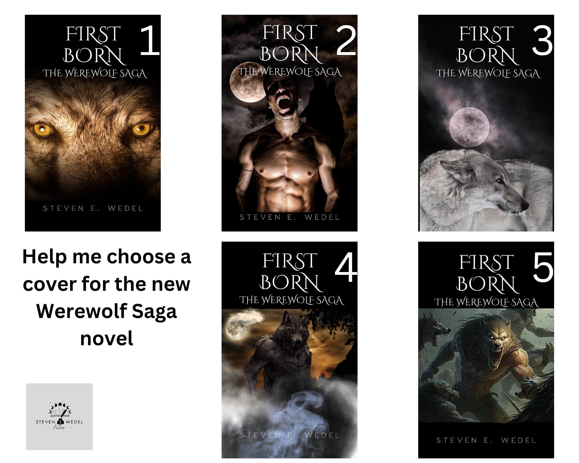 There are several other irons in the fire. I’ve done a couple of polls to get reactions for various covers for First Born, the new book in The Werewolf Saga. I most recently put up these five options on Facebook:
